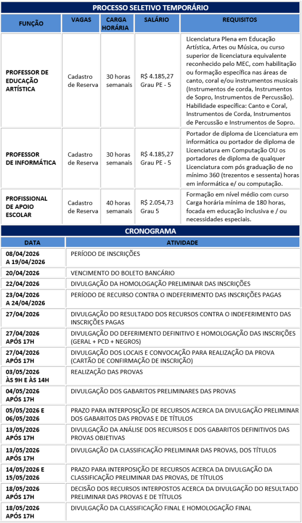 Vale ressaltar que o processo seletivo é valido para contratação por tempo determinado, com vigência para o atendimento de demanda no ano letivo de 2026. A divulgação dos gabaritos preliminares das provas será no dia 4 de maio, após as 17 horas.