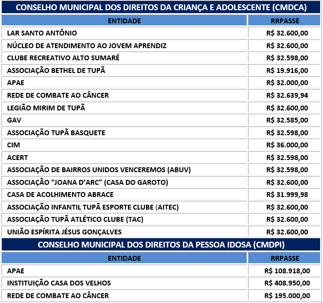 Ela explicou também que para ter direito aos recursos, as Organizações da Sociedade Civil apresentaram projetos que foram analisados e aprovados pelo CMDCA e pelo CMDPI. As OSC que atendem Criança e Adolescente que receberam recursos foram: Lar Santo Antônio, que recebeu R$ 32.600,00; Núcleo de Atendimento ao Jovem Aprendiz (R$ 32.600,00); Clube Recreativo Alto Sumaré (R$ 32.598,00); Associação Bethel (R$ 19.916,00); APAE (R$ 32.000,00); Rede Feminina de Combate ao Câncer (R$ 32.639,94); Legião Mirim (R$ 32.600,00); Associação Educacional, Cultural, Social e Esportiva de Tupã (GAV) (R$ 32.585,00); Associação Tupã Basquete (R$ 32.598,00); CIM (R$ 36.000,00); ACERT (R$ 32.598,00); Associação Unidos Venceremos - ABUV (R$ 32.598,00); Casa do Garoto (R$ 32.600,00); Casa Abrace (R$ 31.999,98), AITEC (R$ 32.600,00), Associação Tupã Atlético Clube – TAC (R$ 32.600,00) e União Espírita Jésus Gonçalves (R$ 32.600,00).
