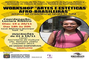 A prefeitura;* por meio da Secretaria Municipal de Cultura;* promove entre os dias 19 e 20 de outubro o workshop “Artes e Estéticas Afro-Brasileiras”;* que faz parte da programação da Semana da Consciência Negra.