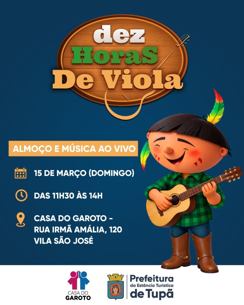 O Fundo Social de Solidariedade, em parceria com a Casa do Garoto, realiza neste domingo, dia 15 de março, as “10 Horas de Viola”, evento beneficente que reúne violeiros de Tupã e de cidades da região em uma grande celebração da música sertaneja raiz.
